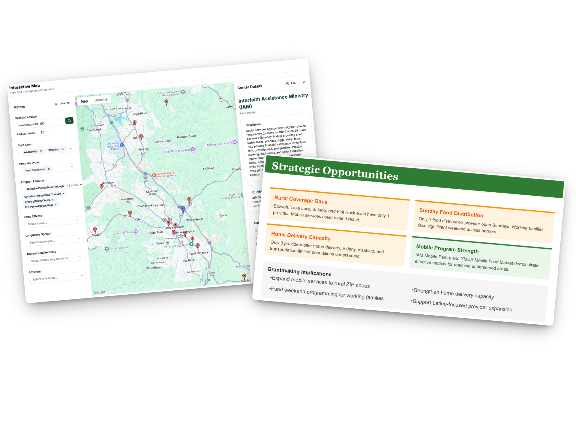 In partnership with the Community Foundation of Henderson County, FastRoots documented the region's complete food assistance ecosystem with interactive mapping—40 providers across multiple program types and service models.