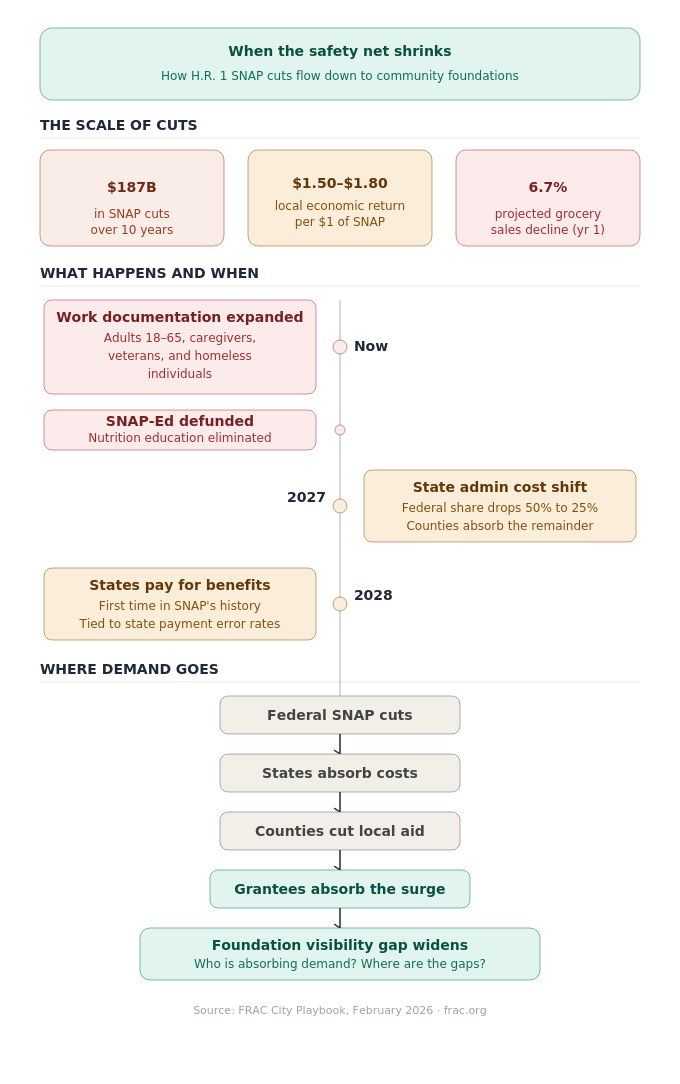 The Food Research and Action Center (FRAC) published a City Playbook in February 2026 aimed at municipal leaders preparing for these impacts. It is worth reading even if you work in philanthropy rather than city government, because the document makes something uncomfortably clear: when federal food assistance contracts, the demand doesn't disappear. It redistributes. And a significant portion of it lands on the organizations community foundations fund.
